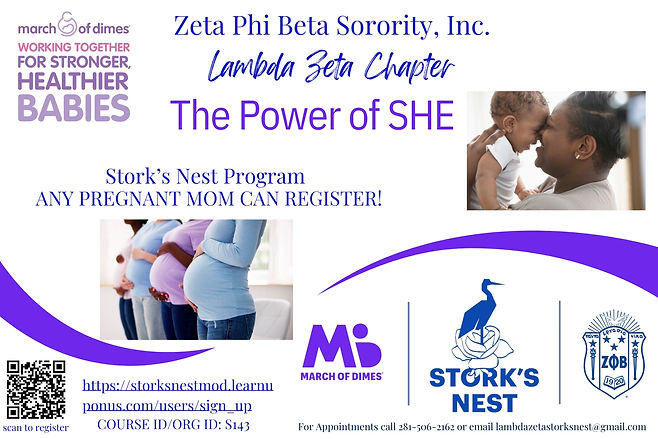 Stork’s Nest is a long-standing national partnership between Zeta Phi Beta Sorority, Inc. and the March of Dimes, designed to promote early and consistent prenatal care. Established in 1971 and adopted nationally by Zeta in 1972, the first official Nest was opened by the Lambda Zeta Chapter in Houston, Texas. Today, the chapter operates a Stork's Nest at Augustana Lutheran Church on Wheeler Avenue.